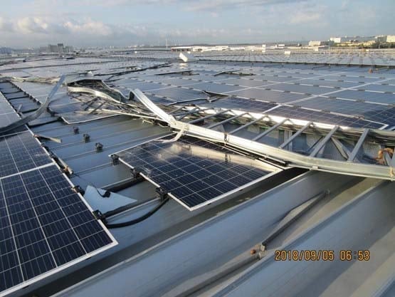 パネルの取付⾦具は、パネル⼀部を挟み込んだ状態で屋根に残っていることから、台風の最大風速が、設計上の数値(34m/s)を大幅に超えたために破損したものと見られており、一部破損した太陽光発電パネルから発火する現象も確認されています。